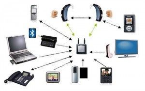 Gli apparecchi acustici più evoluti implementano lo standard di comunicazione a radiofrequenza Bluetooth, il quale consente il collegamento a vari dispositivi senza usare cavi. Questa tecnologia offre maggiore flessibilità e libertà di movimento. Essa infatti garantisce un collegamento stabile e senza interferenze fino ad una distanza di circa 5 metri. I dispositivi compatibili a cui è possibile connettere l’apparecchio acustico sono il telefono cellulare e fisso, il televisore, il computer, il lettore mp3.